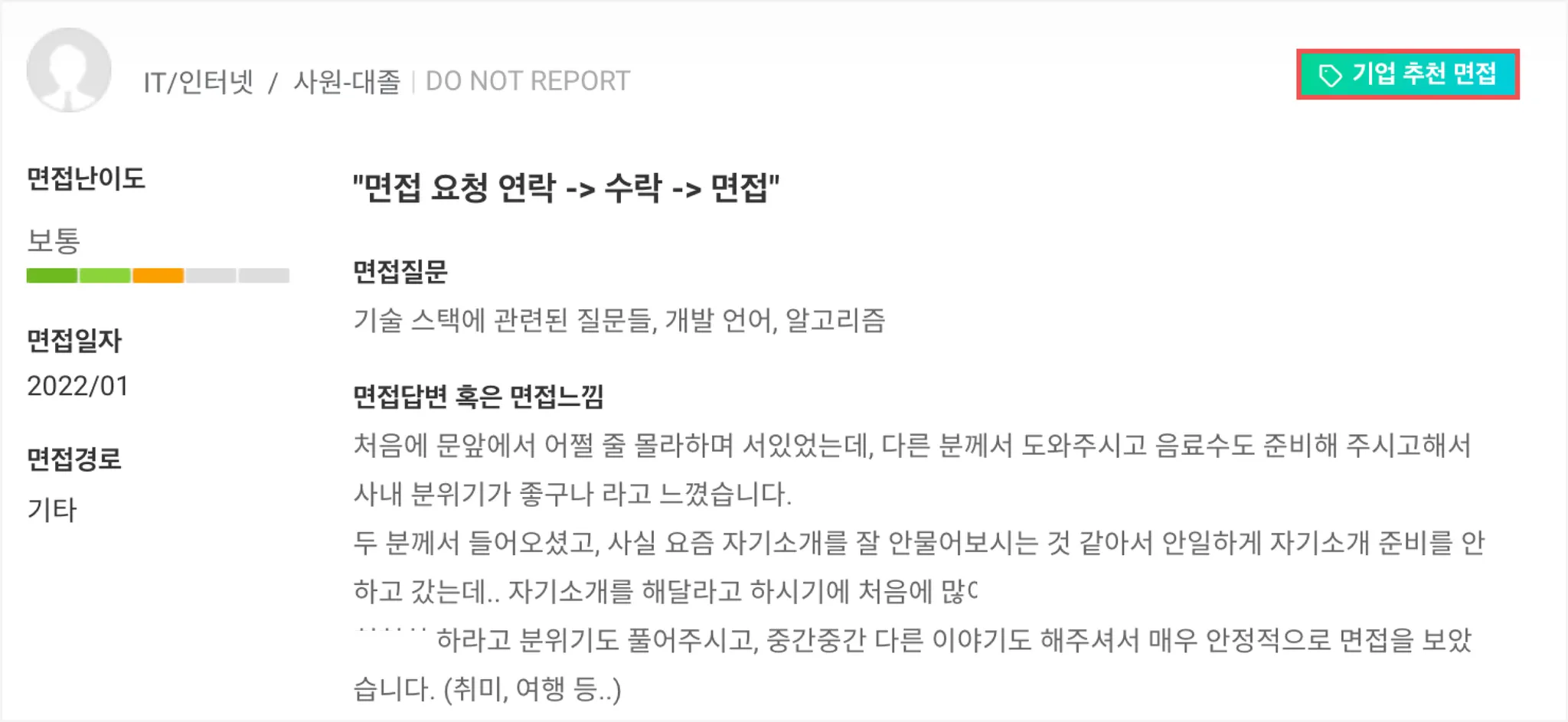 - 구직자들은 잡플래닛 면접 후기를 통해 면접 분위기, 자주 나오는 질문 등을 확인하고 있습니다.