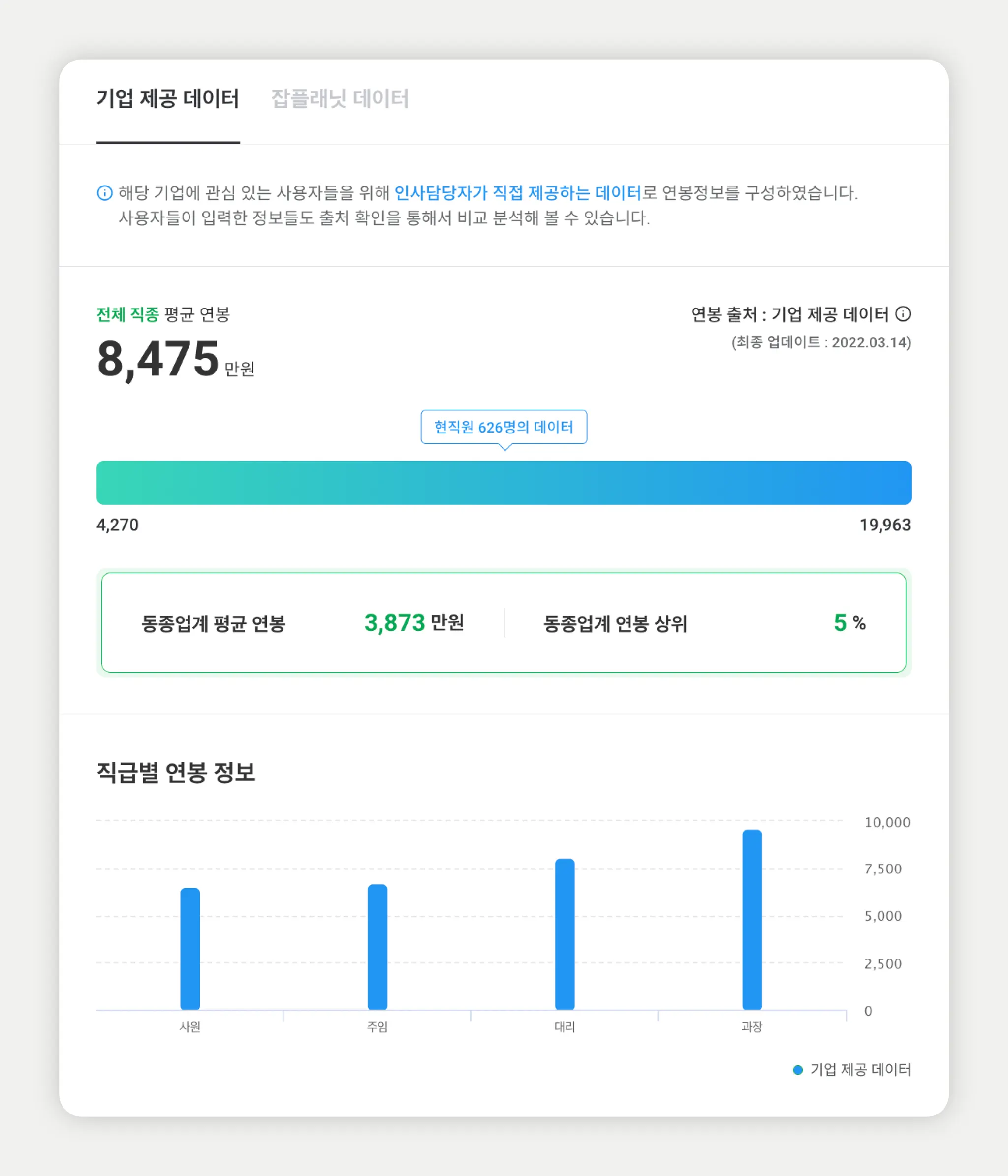 연봉정보 제공 시 기업 제공 데이터가 잡플래닛 데이터보다 우선적으로 노출됩니다.