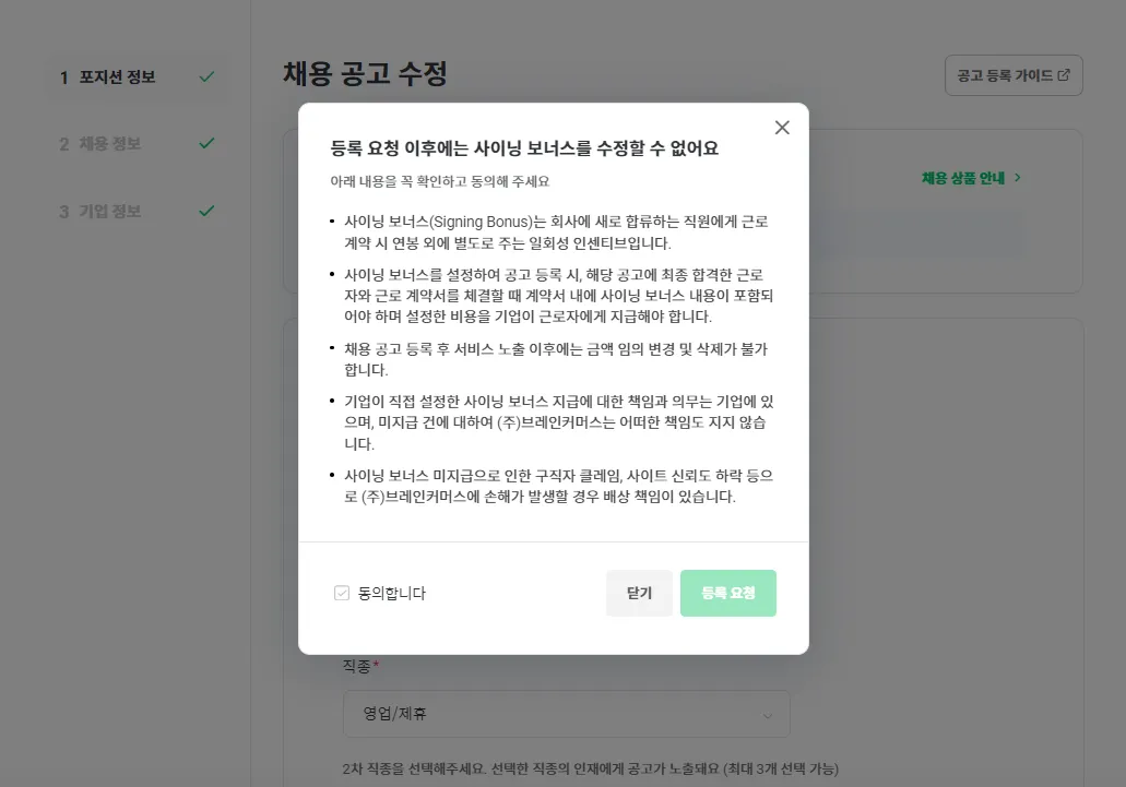 사이닝 보너스를 설정한 후 채용 공고 등록 요청 시 사이닝 보너스 관련 안내를 확인하실 수 있습니다.