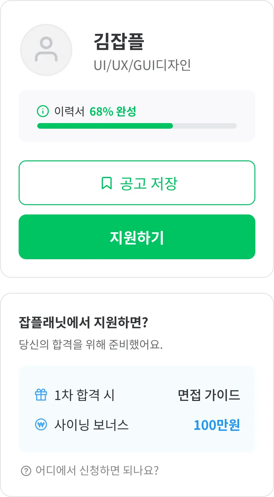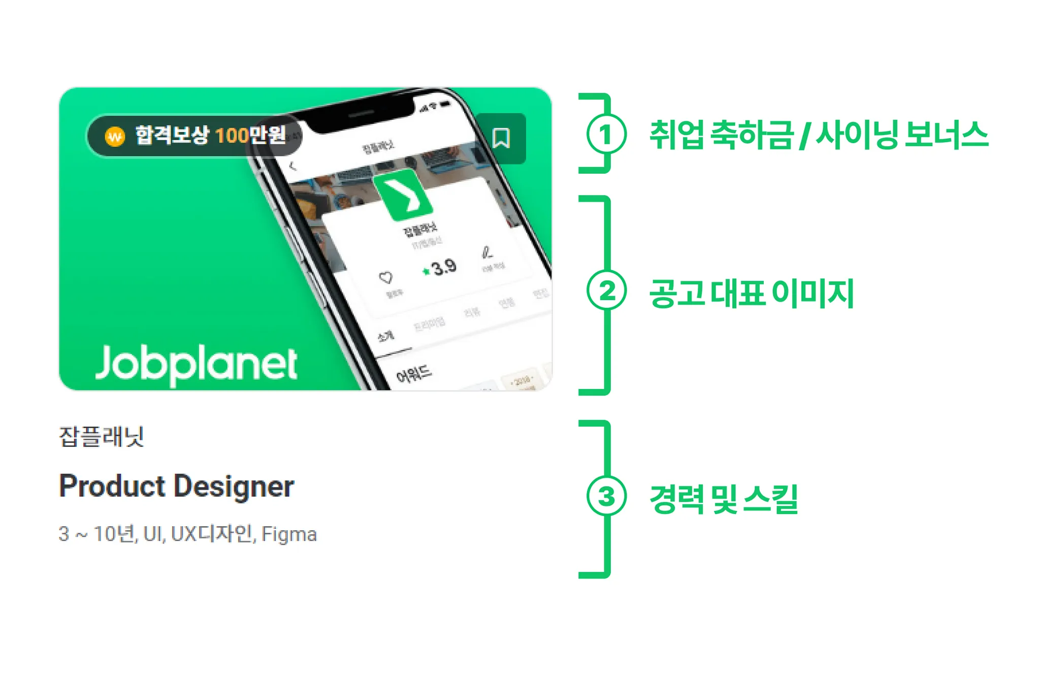 구직자들이 공고내용을 한 번에 알 수 있는 요약카드 형태로 노출됩니다.