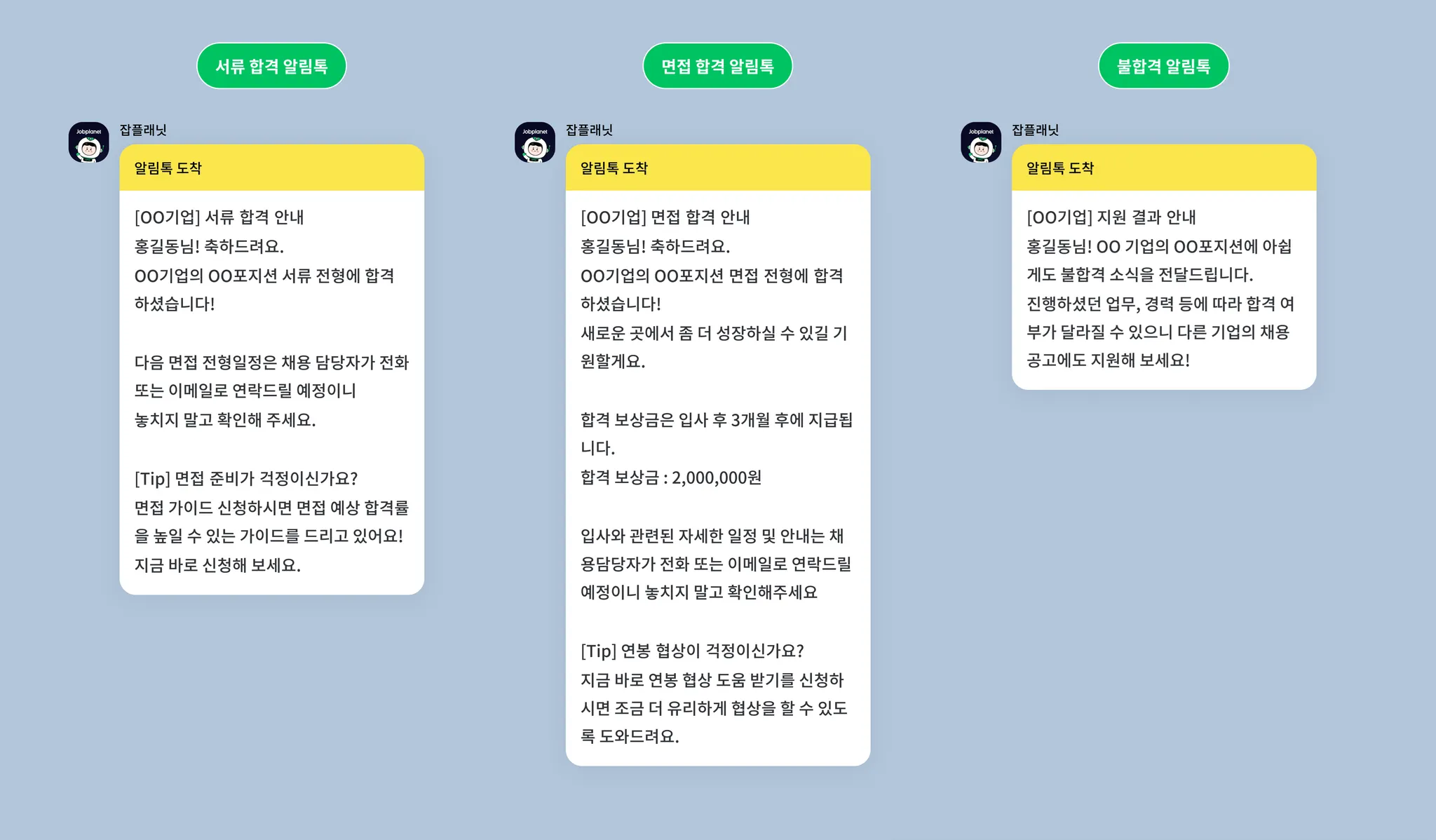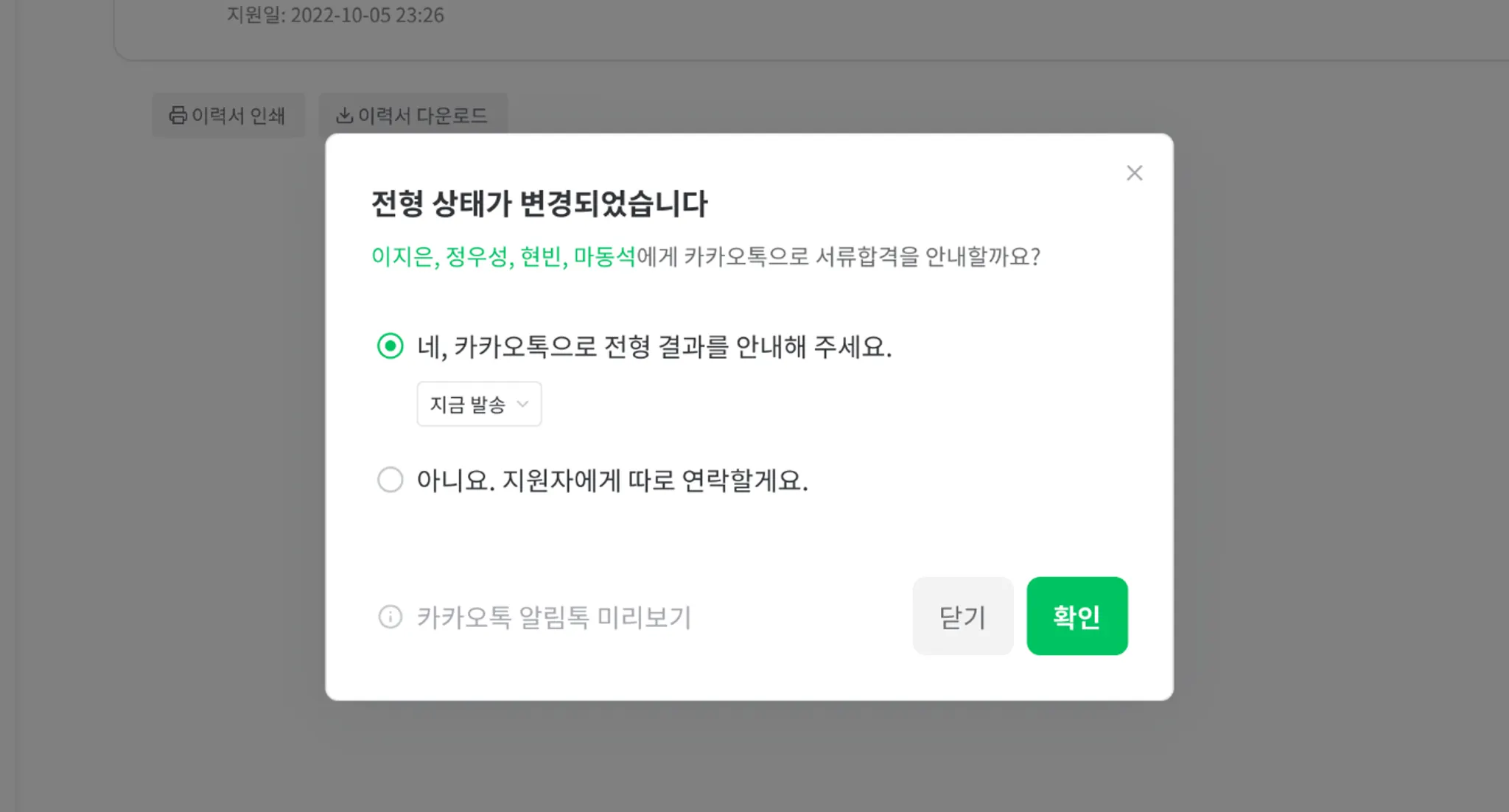 지원자의 합격/불합격 여부를 선택하시면 알림톡 전송 여부를 선택하실 수 있습니다.
