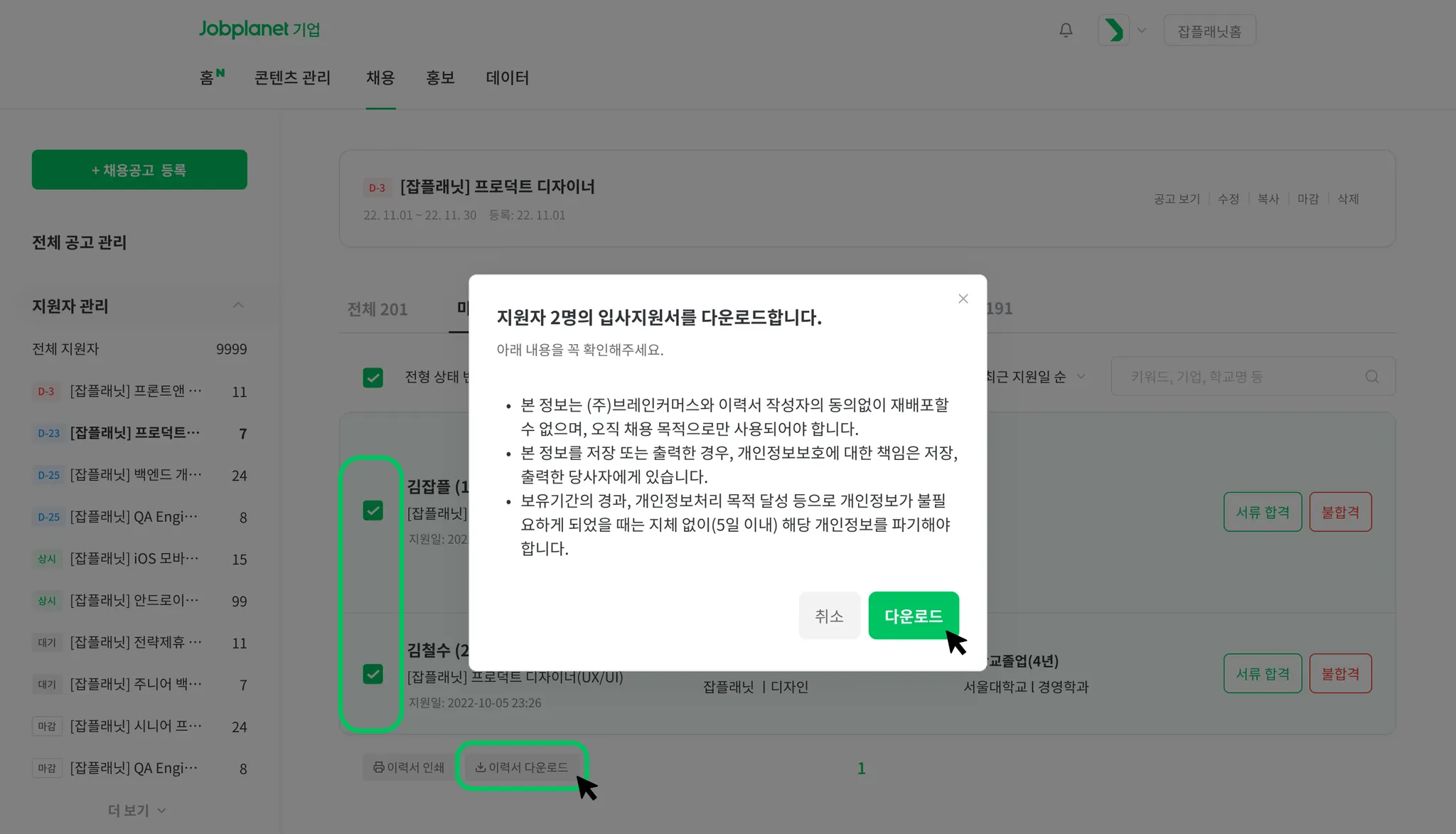 지원자의 이력서를 일괄로 다운로드 가능합니다.