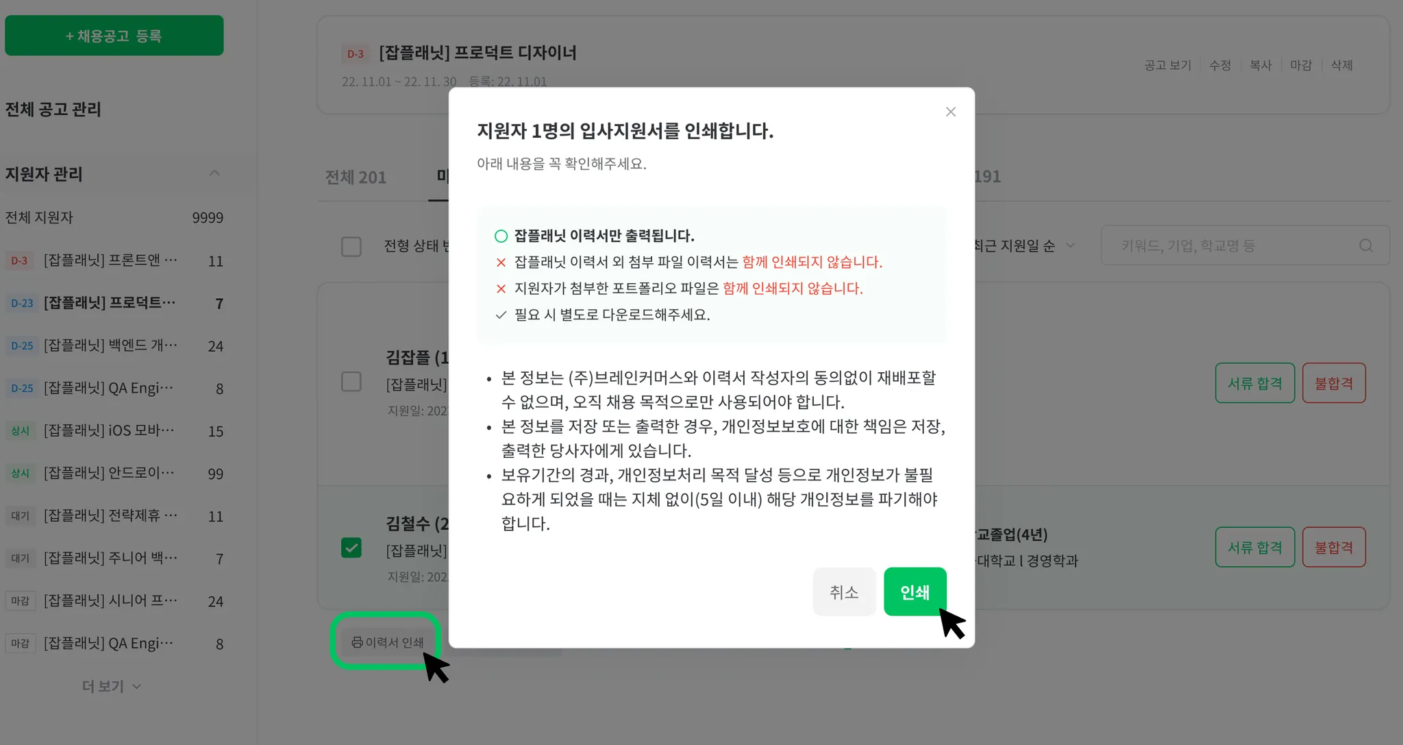 인쇄하고 싶은 지원자의 이력서를 선택하여 인쇄가 가능합니다.